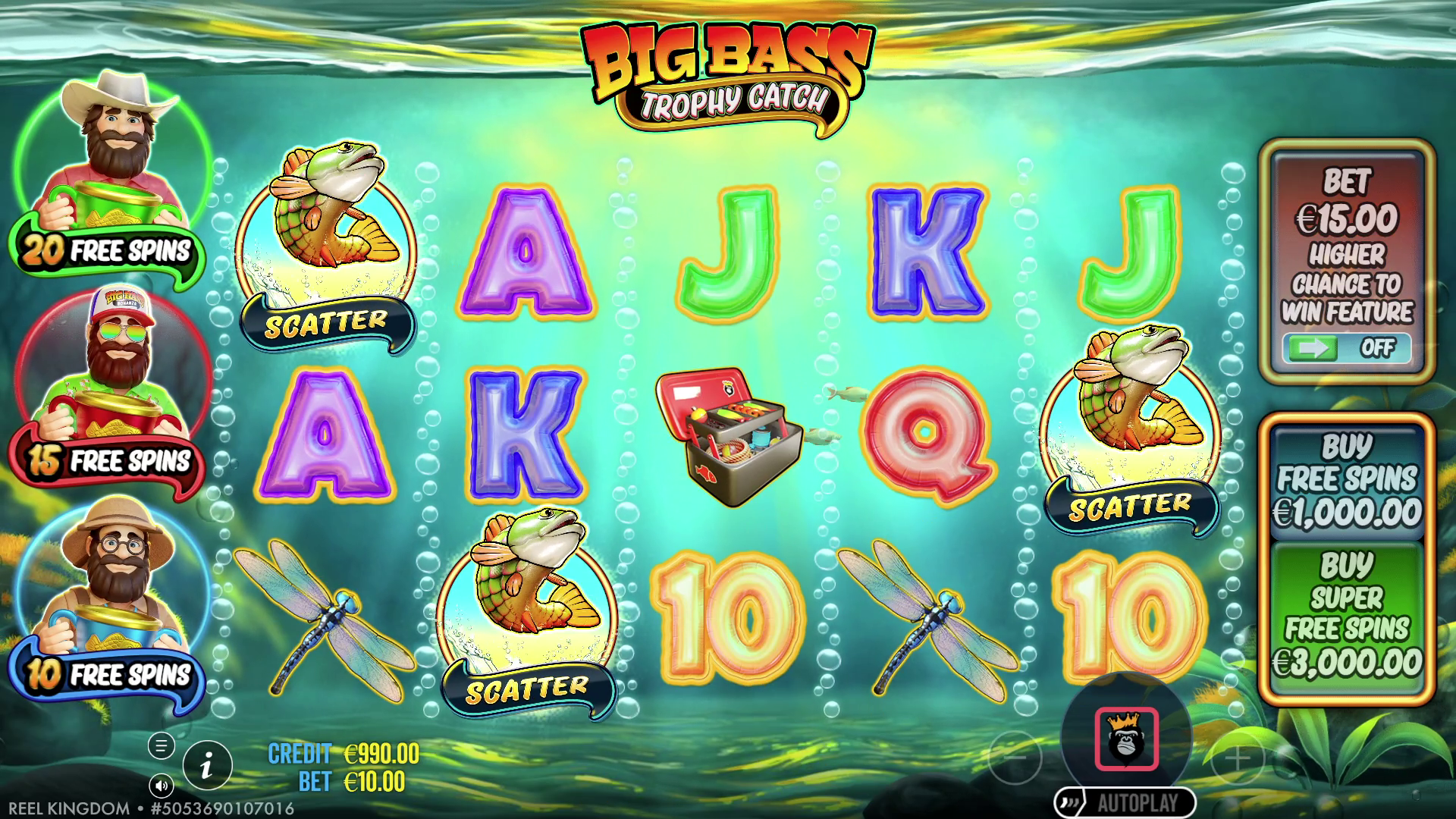 Trophy Catch operates on a 5×3 grid configuration that maintains consistency with other titles in the Big Bass franchise. The slot uses 10 fixed paylines, meaning you cannot adjust the number of active lines during gameplay. Winning combinations form when matching symbols land on adjacent reels from left to right, starting at the leftmost reel.
